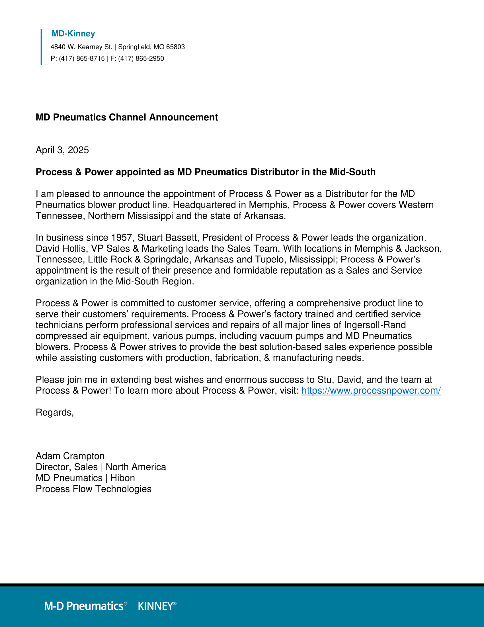 Process & Power has been appointed as the official MD Pneumatics distributor for the Mid-South region. Serving TN, MS, and AR, we’re ready to deliver top-tier solutions and service to our customers.