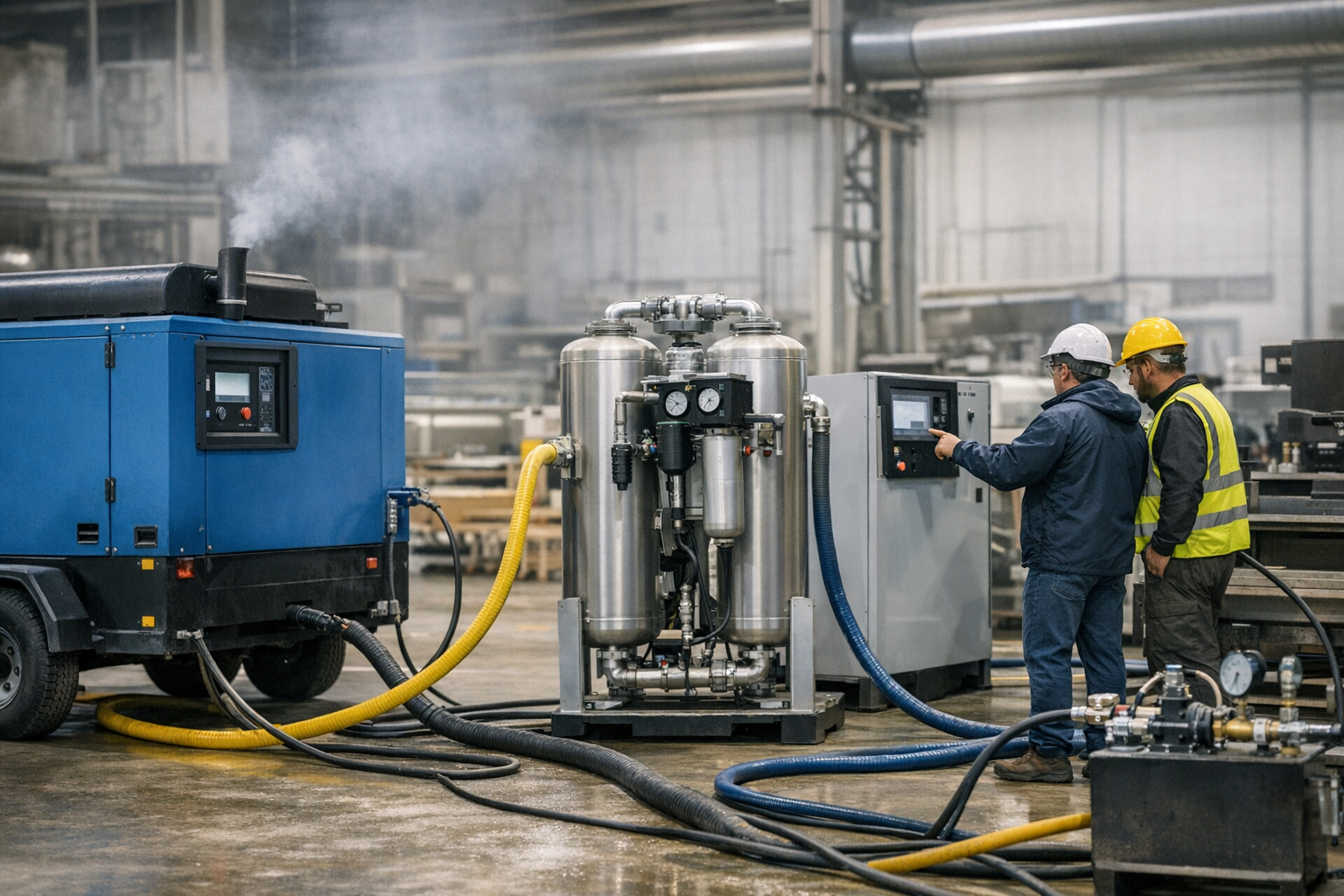 Before the rental is installed, inspect the distribution system, separators, filters, valves, and controls. After the rental is running, keep watching the pressure drop, temperature, and moisture levels. That gives you a better shot at getting the permanent system back in shape without another outage.
